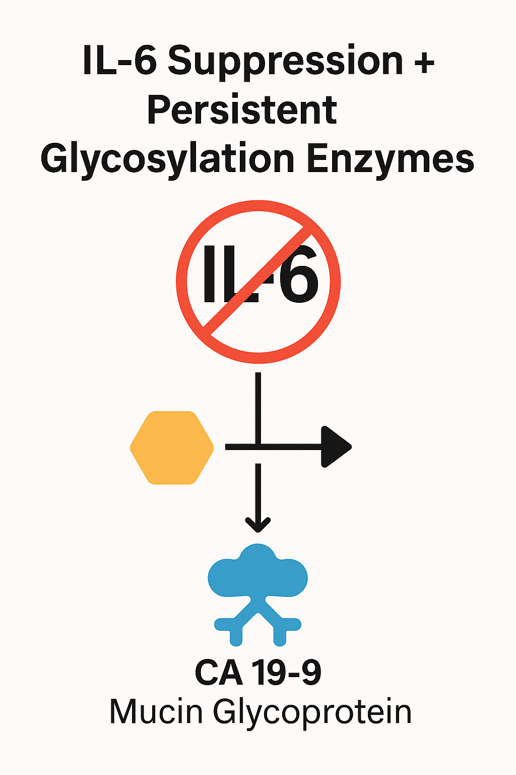 - Persistent glycosylation ≠ persistent inflammation: CA 19-9 is the sLe^a glycan borne on mucins (notably MUC1/MUC5AC). Once the fucosylation/sialylation axis (FUT3, ST3Gal-III) is “on,” antigen output may continue even as IL-6/STAT3/NF-κB signaling quiets, explaining CA 19-9↑ with IL-6↓ [1, 2, 5, 6].