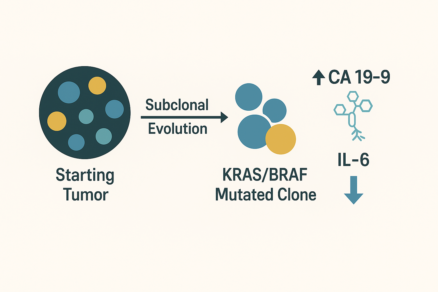 Figure 3: Subclonal evolution schematic: starting tumor → emergent KRAS/BRAF‑mutant clones → CA 19‑9↑ with IL‑6↓.