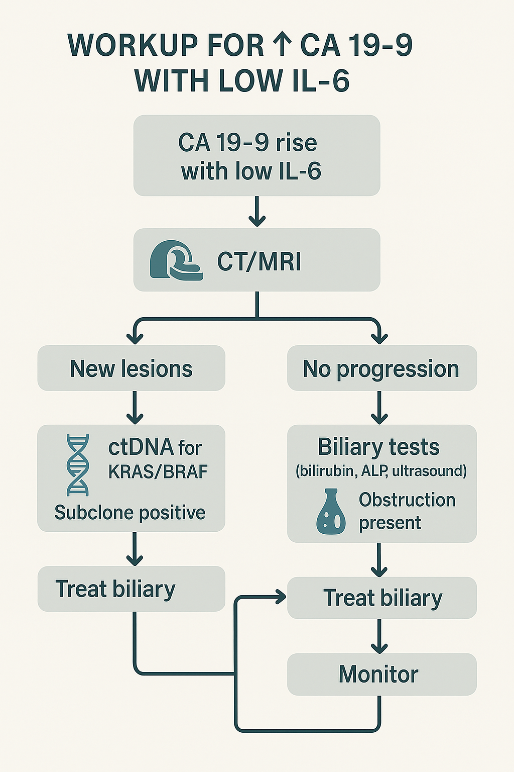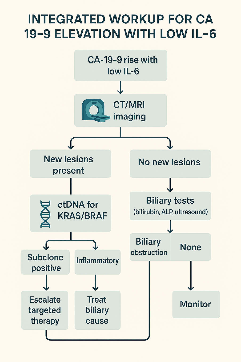 Figure 5: Workup flowchart for CA 19‑9 elevation with low IL‑6 (CT/MRI; ctDNA when progression; biliary tests when stable; treat accordingly; monitor).