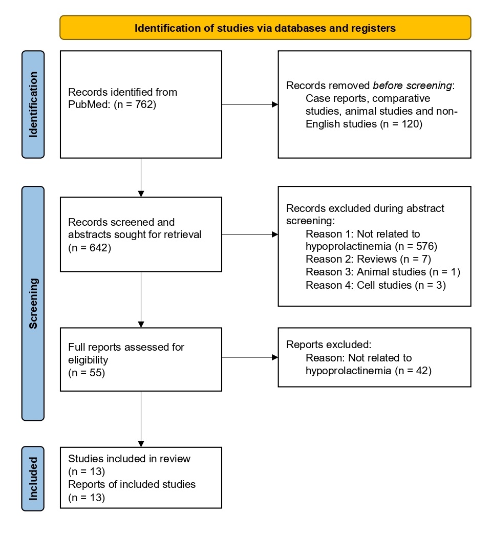 Figure 2: PRISMA flow diagram demonstrating the flow of study identification, screening, and inclusion. The original PubMed search resulted in 762 records. Prior to abstract screening, 120 records were removed because they were identified as case reports, comparative studies, animal studies, or non-English studies. This left 642 records to enter abstract screening, during which 587 records were excluded for the following reasons: 576 were not related to hypoprolactinemia, 7 were reviews, 1 was an animal study, and 3 were cell studies. The remaining 55 records were assessed for eligibility by screening full-text articles, during which 42 reports were excluded because they were not related to hypoprolactinemia, leaving 13 studies included in our analysis.