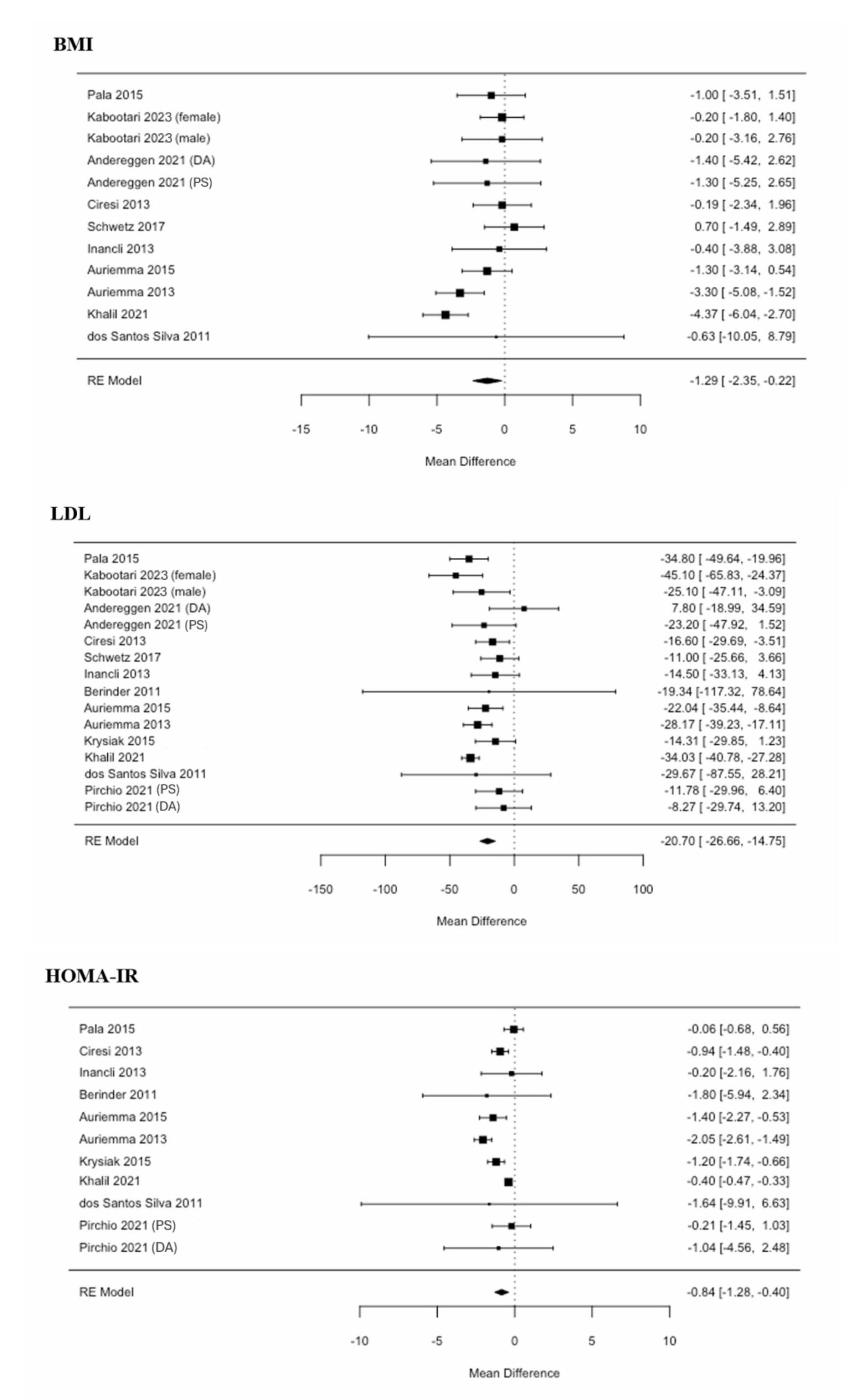 Figure 4. Forest plots of the mean differences before and after treatment. Mixed-effect meta-regression models were employed to assess the impact of treatment. None of these associations were statistically significant. Thus, in patients who underwent prolactinoma treatment, a change in prolactin was not significantly associated with a change in BMI, LDL, or HOMA-IR. BMI: body mass index; DA: dopamine agonist; F: female; HOMA-IR: homeostatic model assessment for insulin resistance; LDL: low-density lipoprotein; M: male; PS: pituitary surgery; RE: random effects.