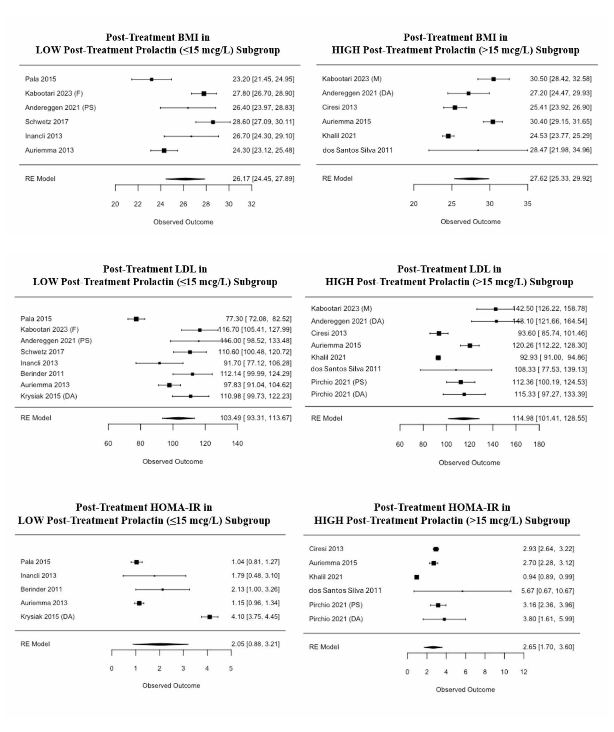 As previously described, the studies were divided into two subgroups: high and low post-treatment prolactin, with a threshold of 15 mcg/L. Data points included in each metabolic sub-analysis were dependent on the availability of the reported data.